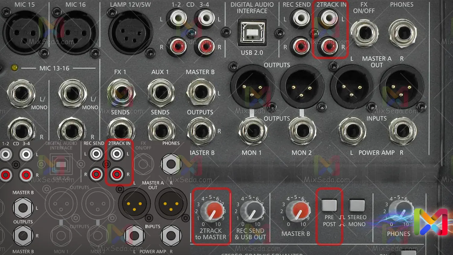 این ورودی با ولوم قرمز رنگ “2Track To Master” کنترل میشود. نکته ای که در اینجا وجود دارد این است که اگر از این ورودی برای پخش صدا استفاده شود ، صدای خروجی به مستر بی ( Master B ) ارسال نمیشود مگر اینکه دکمه پری پست ( Pre/Post ) روشن باشد.