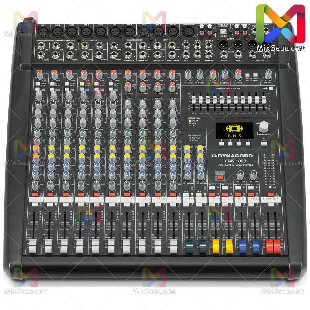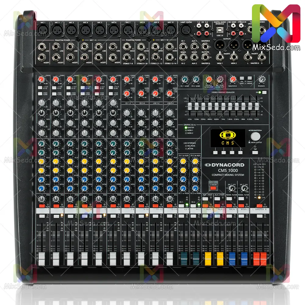 دایناکورد CMS 1000-3 از میکسر های کمپانی دایناکورد ( Dynacord ) دارای 10 خط ( Line ) ورودی میباشد. یعنی شما به صورت استاندارد میتوانید 10 میکروفن را به ورودی های این میکسر متصل کنید.