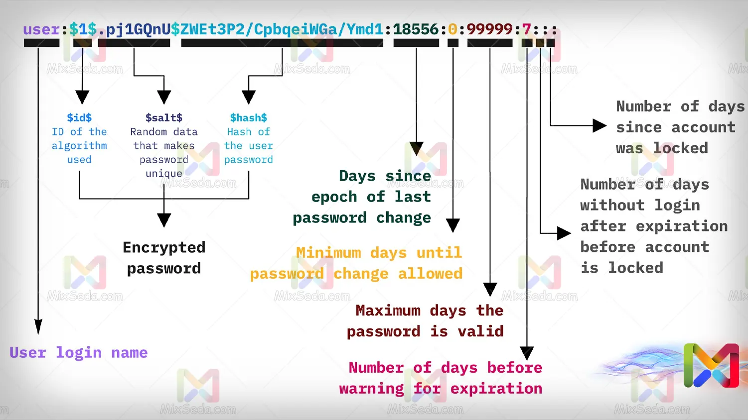 If you take a closer look at the structure of the shadow file, it is designed exactly like a table to store user information. And each column is separated from the next column using the ":" character. Below, I intend to briefly talk about each of the concepts.